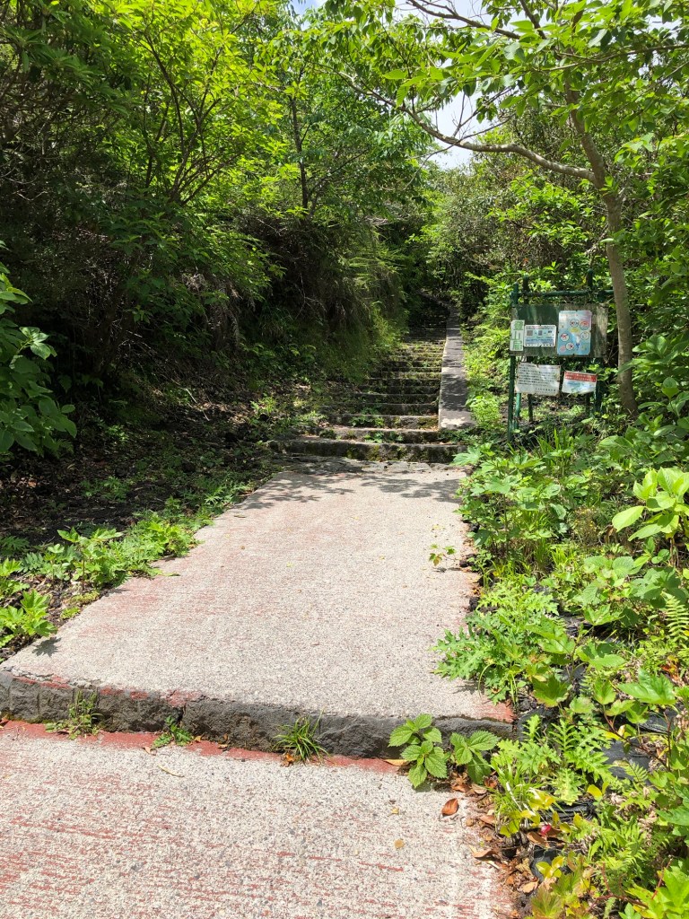 コースは登山口から頂上まで舗装されている。延々と続く階段が徐々に足に堪えてくるが、振り返えれば疲れを忘れる絶景がある。