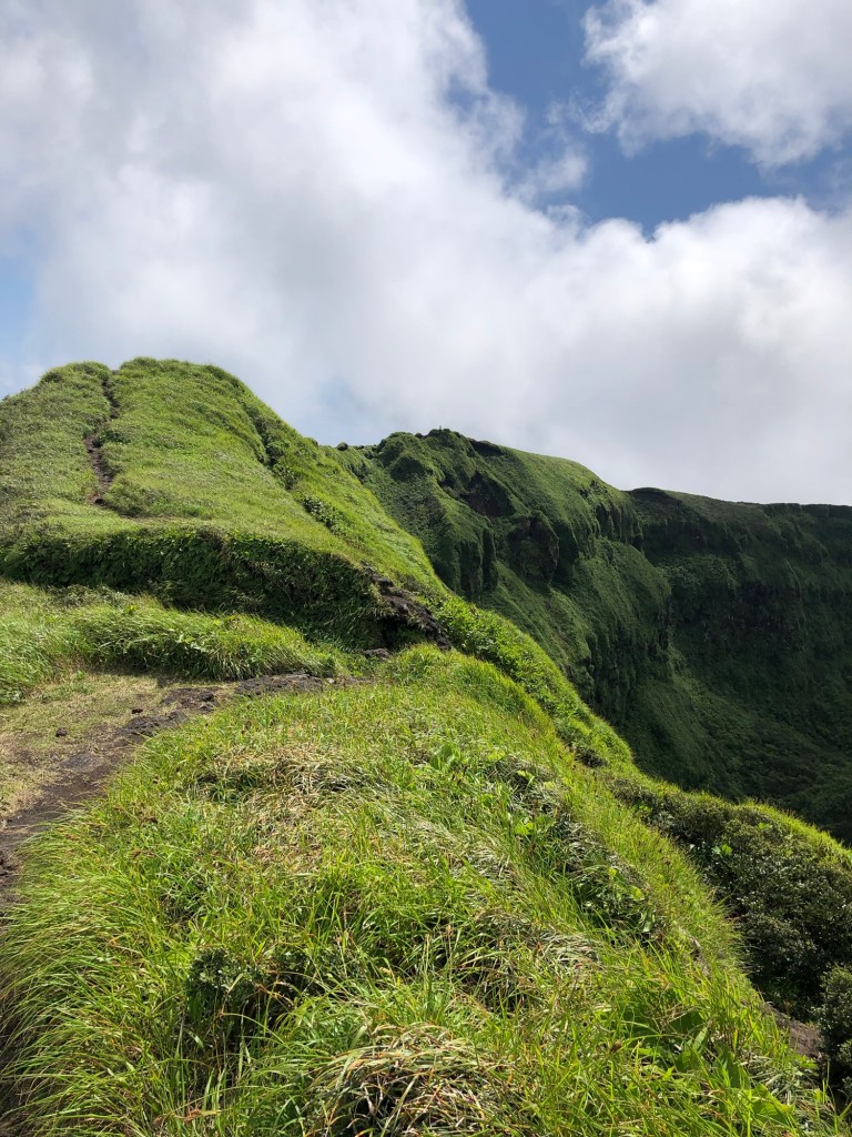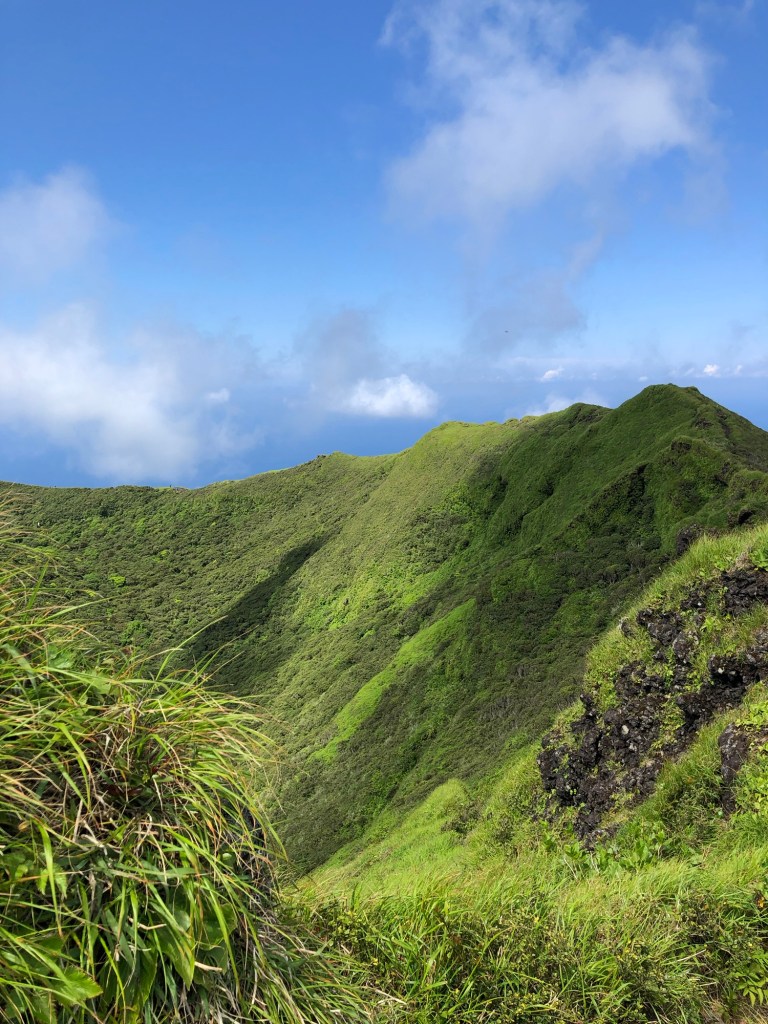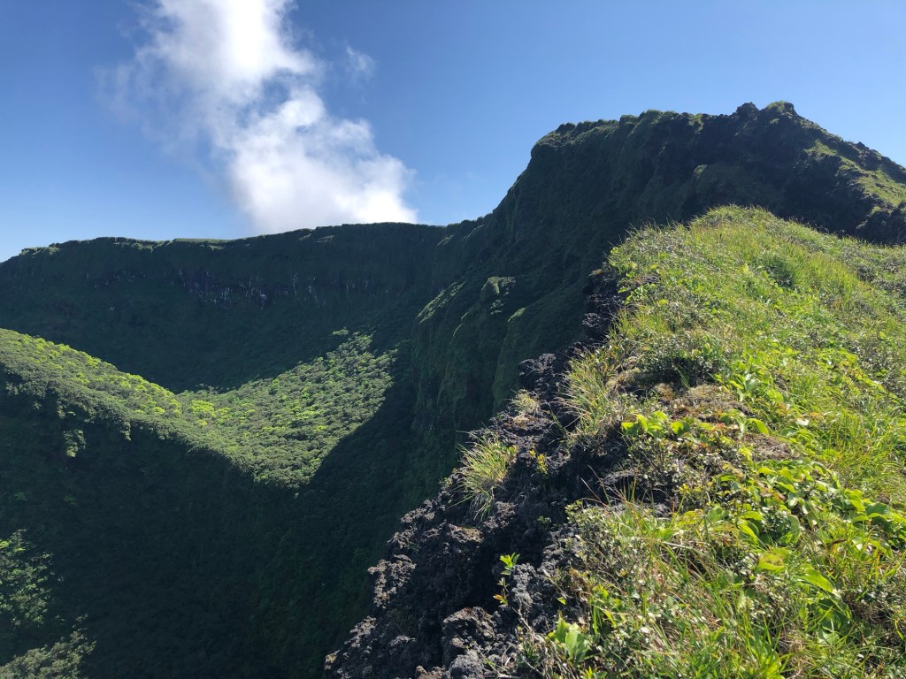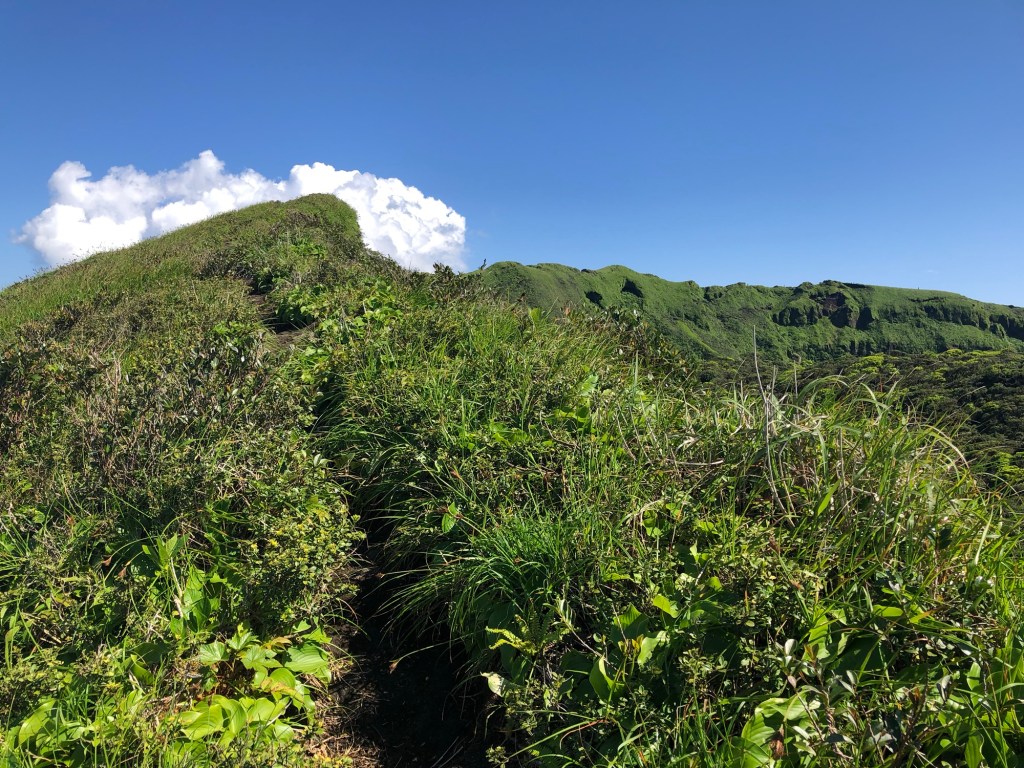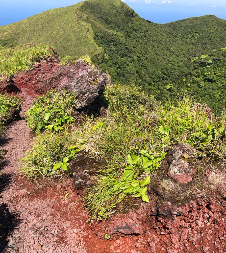 火口は深緑の断崖絶壁。目の前に続く細道をざくざく歩いていく。