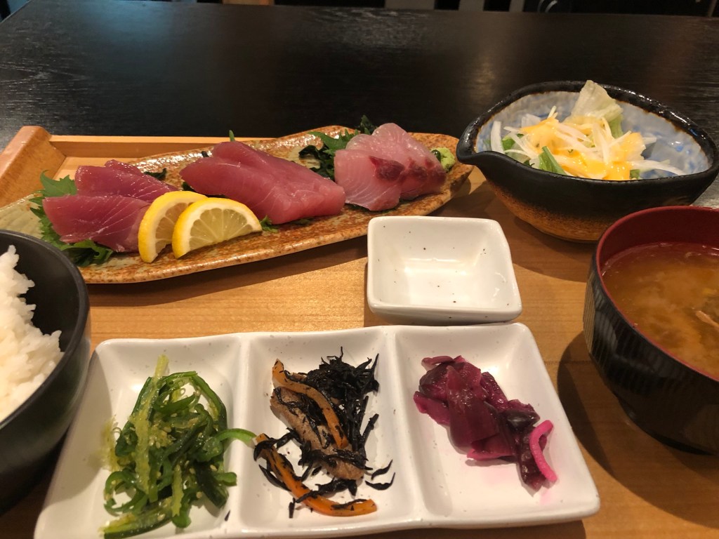 下山後は地元の地魚食堂に直行。地魚のお刺身定食をいただく。15時から休憩に入るお店が多いので事前確認要。