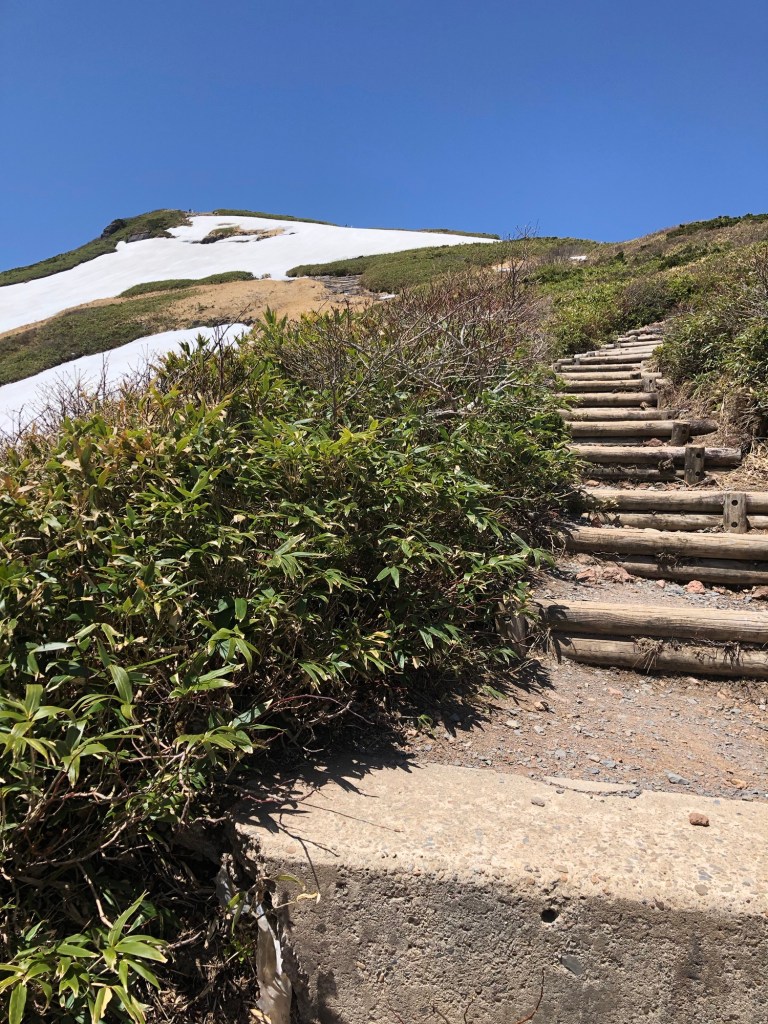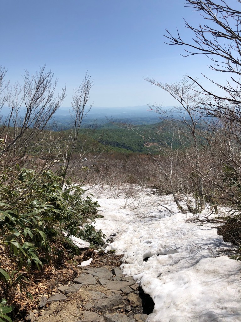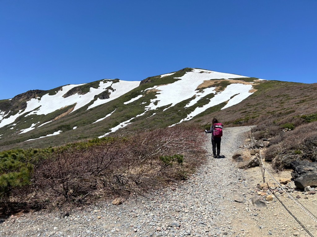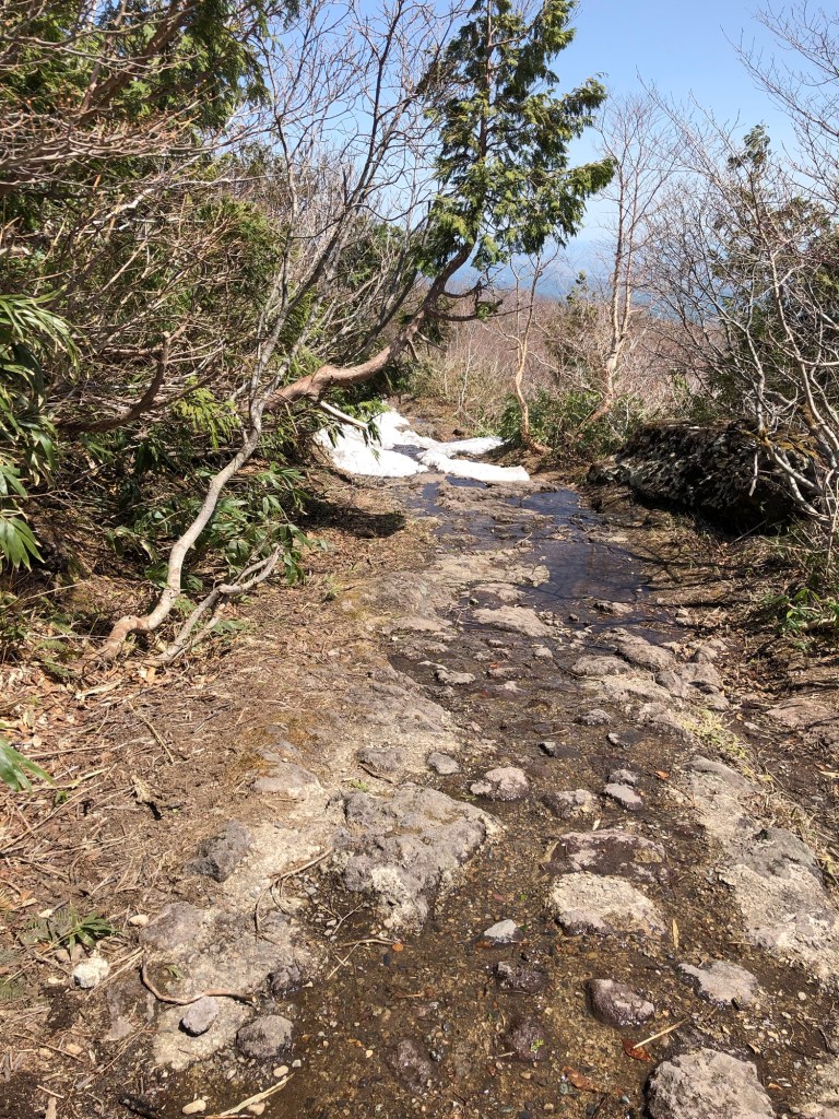 片道1時間半の初心者向けルートを選ぶ。雪が残っているが、整備された登山道に危険箇所はない。