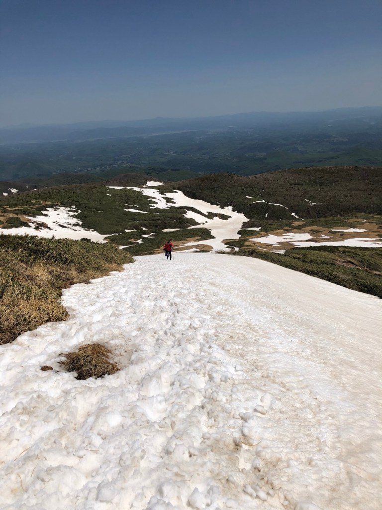 山頂の手前の雪渓は、勾配があり、ポールなしでは危険だ。慎重に渡る。
