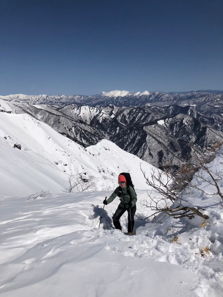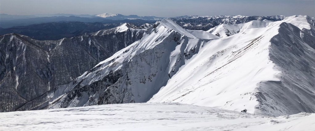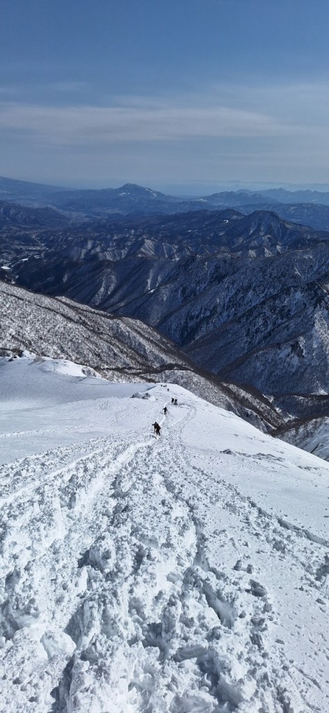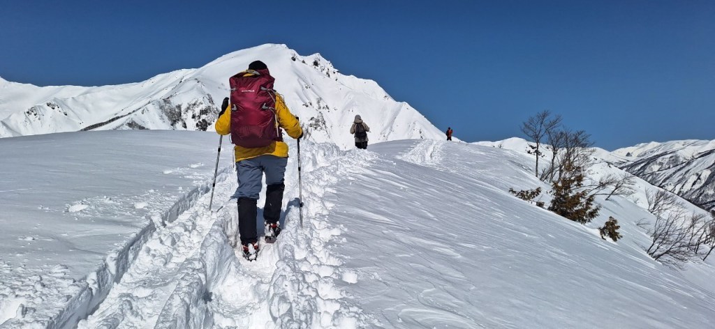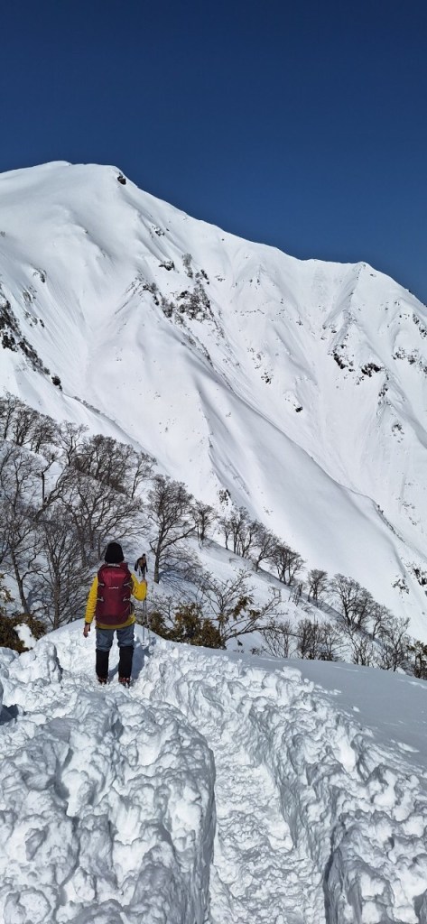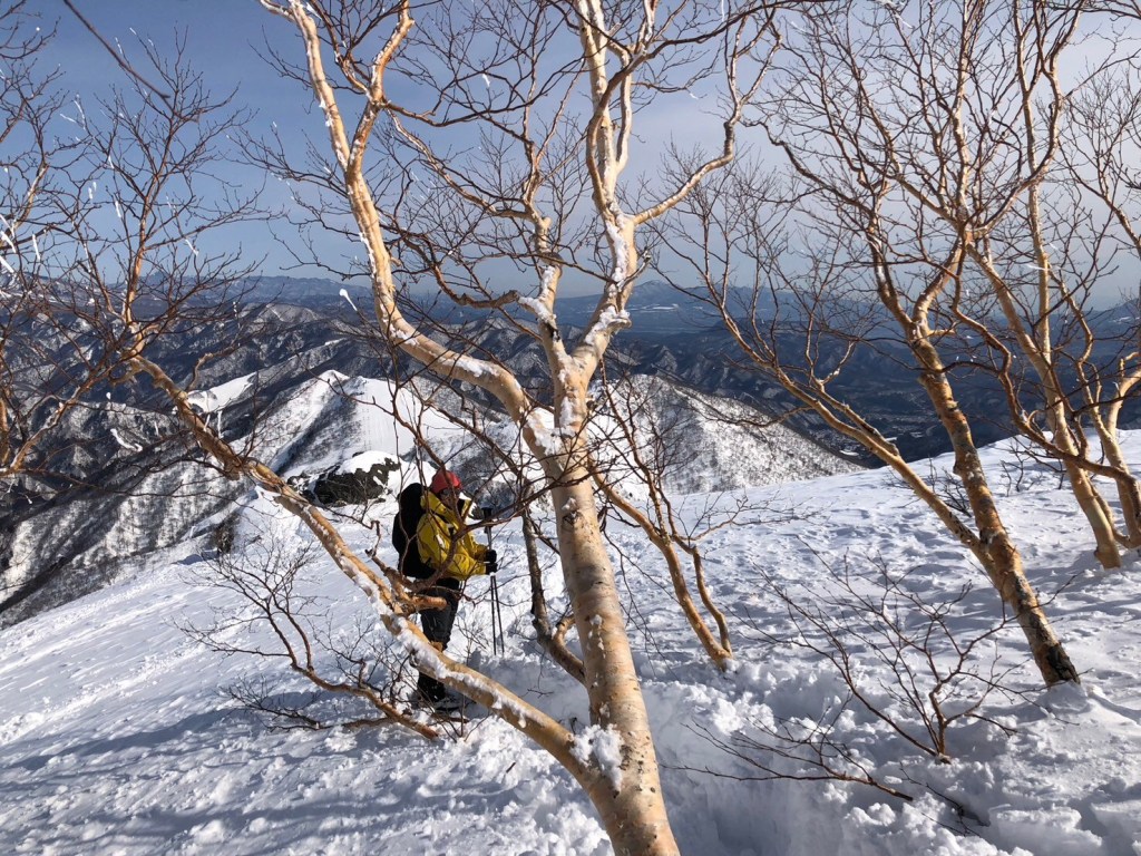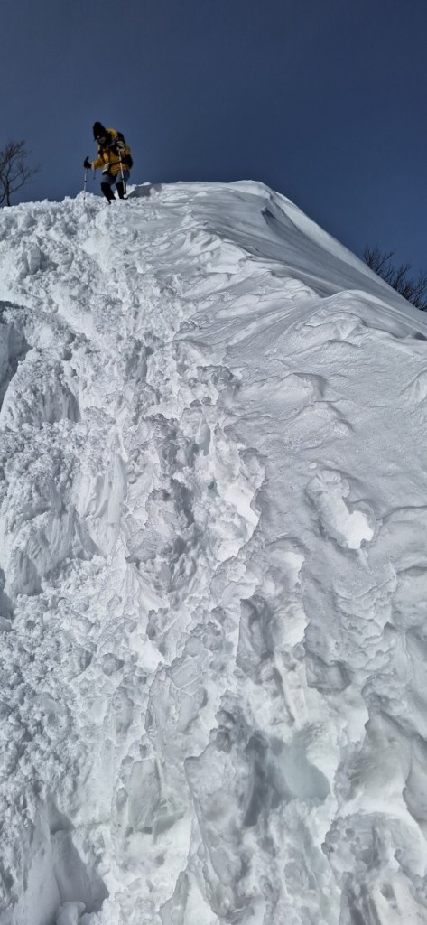 本日は気温が上がったため雪がかなり緩んだ。急勾配と雪の踏み抜きに苦しむ。