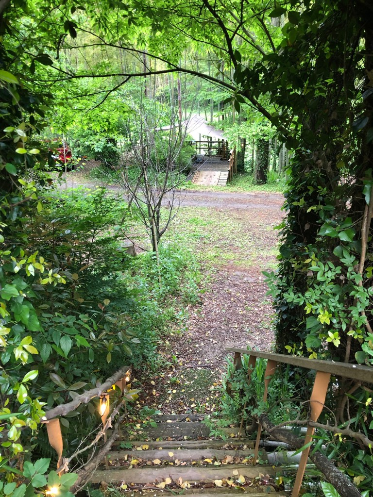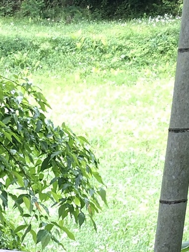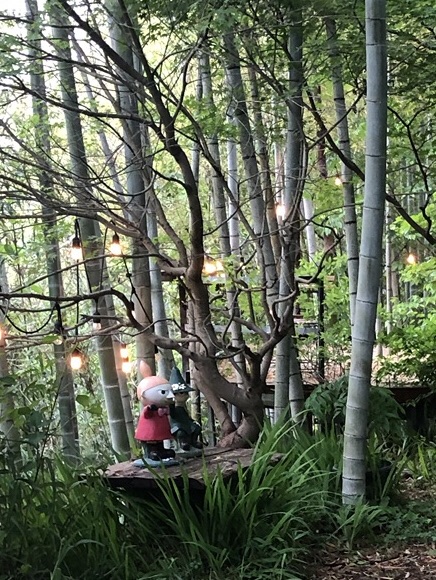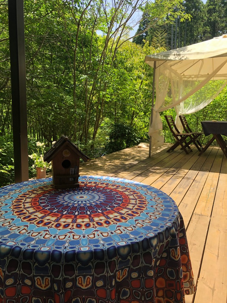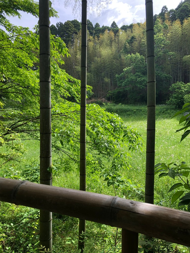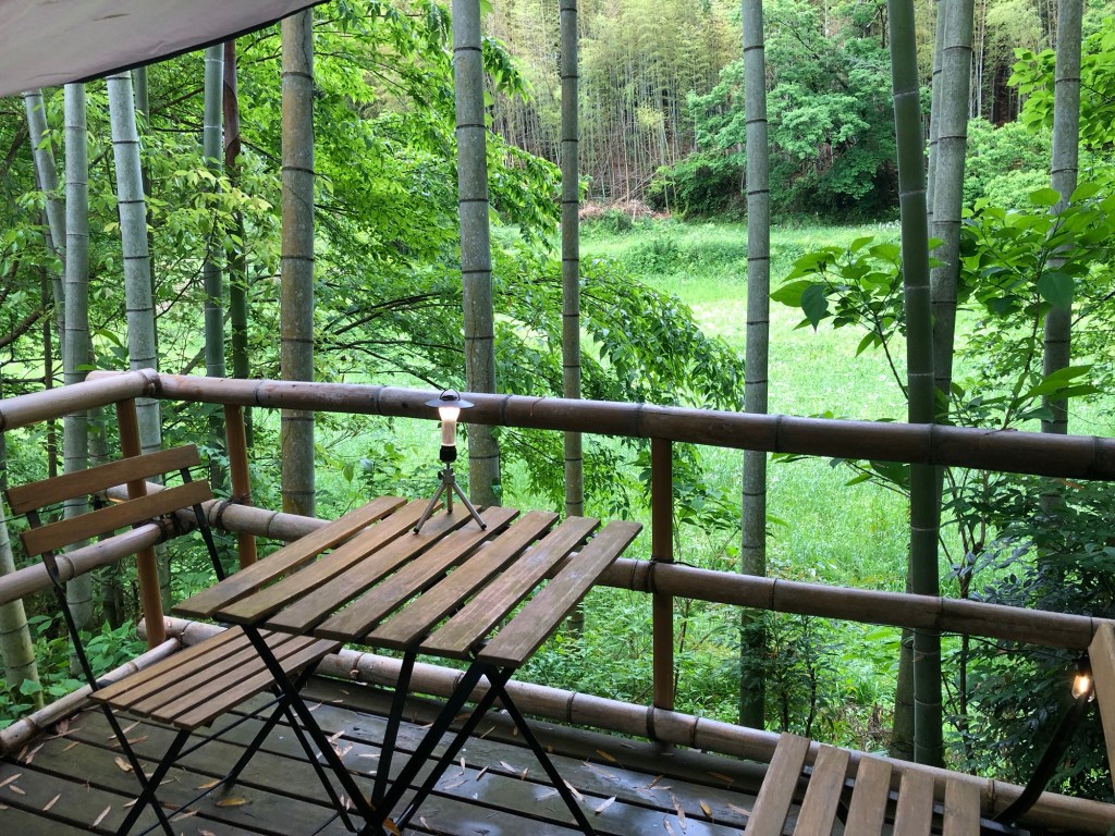 デッキにはテーブルと椅子もある。デッキの傍には竹林があり、その先には野原が広がり春の草花が群生している。