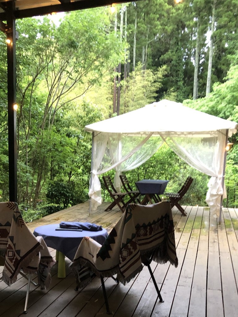 キャンプ場では、オーナーさんが前もってタープを設置しておいてくださった。そしてデッキサイトに変更するよう提案くださった。