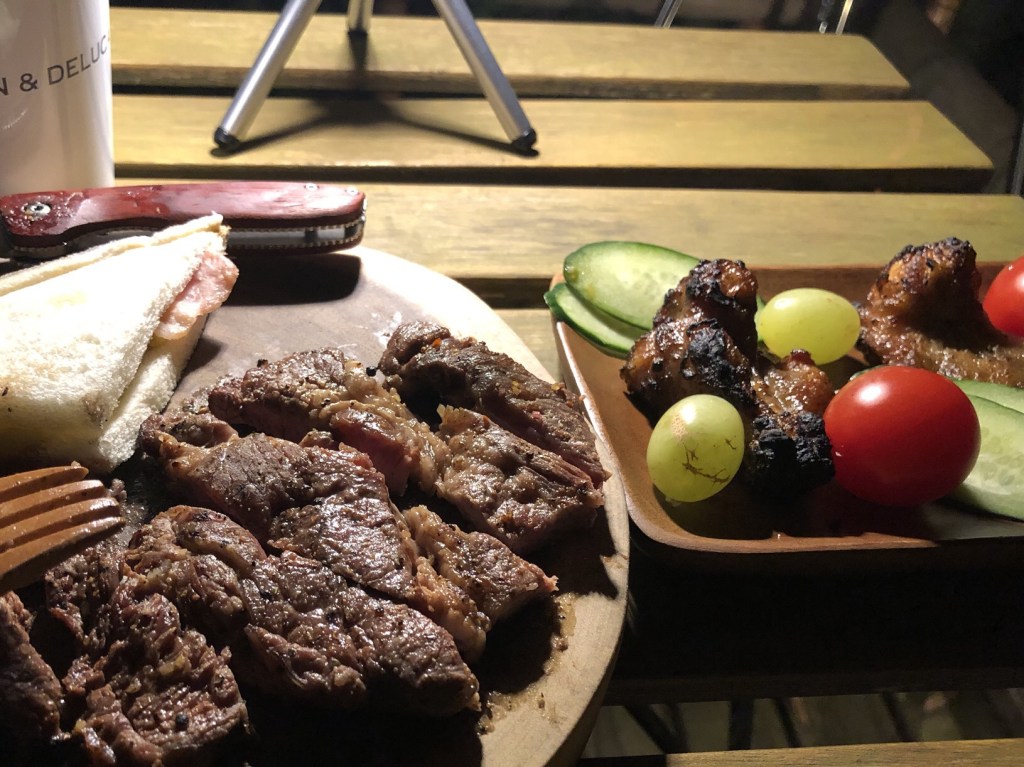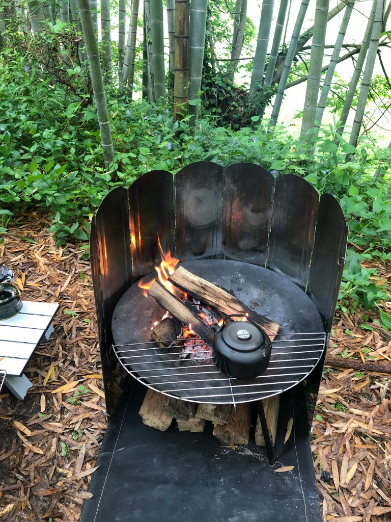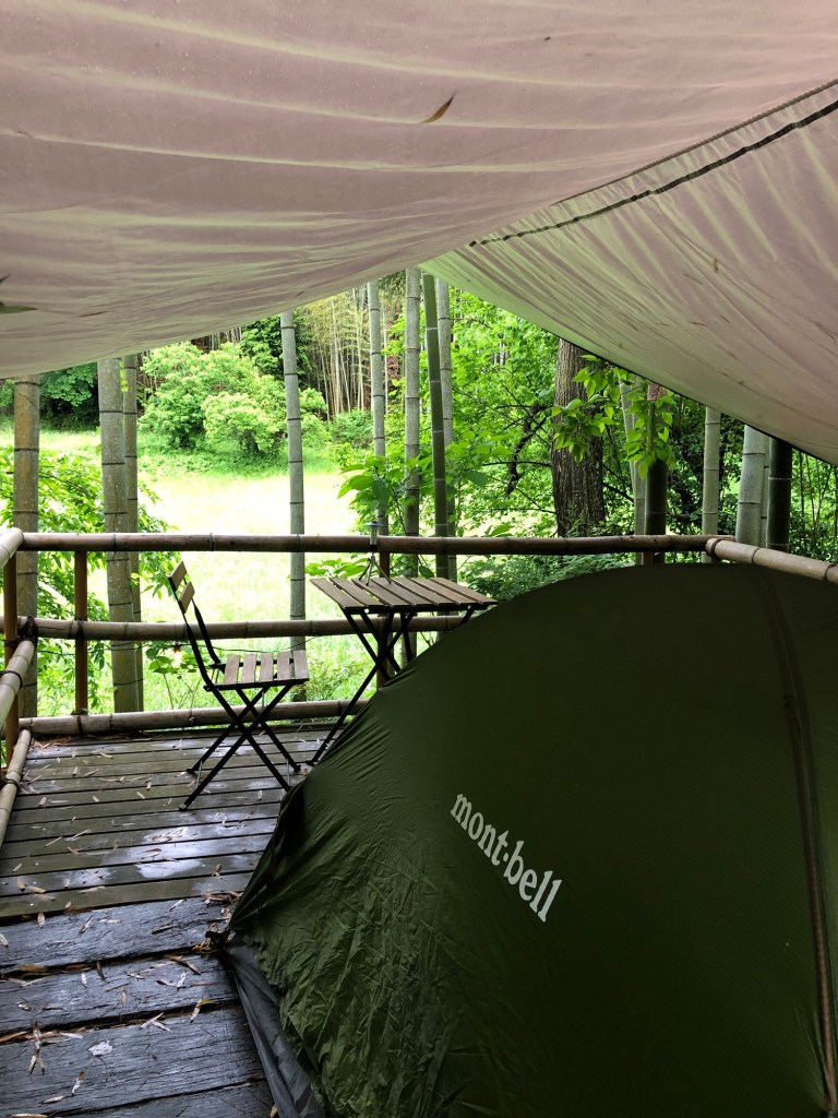 雨は降らなかったが、静かな夜に、タープに竹の葉がパラパラ落ちる音が雨のように聞こえる。