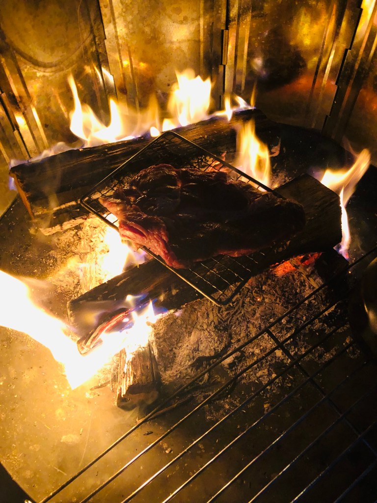 キャンプ飯にはこだわらないが、今回はベーコンと卵とチーズのホットサンドを作る。昔カナダで買ったホットサンドメーカーを直火に放り込む。
